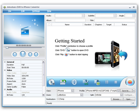 Joboshare DVD to iPhone Converter - лучший конвертер DVD для iPhone и DVD для IPod конвертер, может преобразовать DVD в iPhone MPEG-4, MOV, H.264 видео файлы и конвертировать DVD аудио в iPhone MP3, M4A, AAC аудио файлы с отличным качеством и супер высокой скоростью преобразования. DVD для iPhone конвертор может конвертировать DVD для iPhone, iPhone 3G, iPhone 3GS, iPhone 4, IPod Touch, IPod Touch 4, IPod Classic, IPod Nano, IPod Nano 5G, IPod Nano 6G, IPAD видео и аудио файлы.