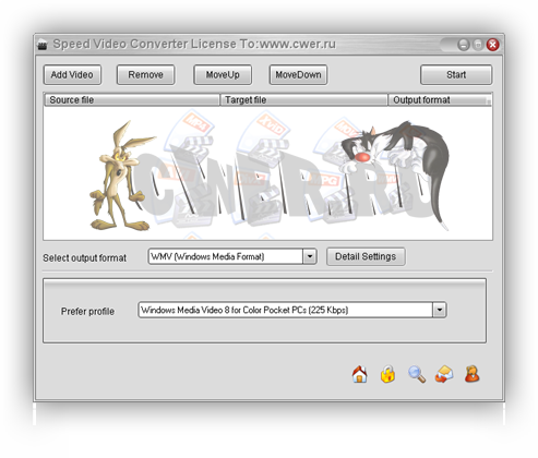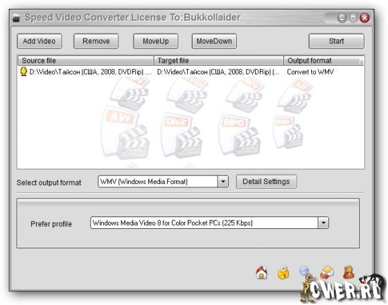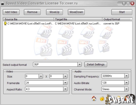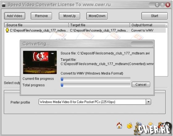 Speed Video Converter предназначена для конвертирования видео файлов. Поддерживает: AVI (Divx, xDiv), MPEG-4, mpeg (vcd, svcd, dvd compatible), wmv, asf, Quick Time, VOB, DAT форматы, присутствуют возможности пакетного конвертирования, обладает высоким качеством и скорость работы, позволяет выбрать и настроить кодеки, имеет простой и удобный интерфейс.