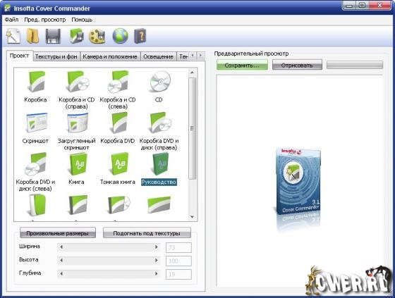 Insofta Cover Commander позволяет создавать профессиональные виртуальные коробки, книги, DVD-коробки, руководства, CD-диски, скриншоты. Всего несколько щелчков мыши все что нужно для выполнения этой работы. Исчерпывающие настройки освещения, камеры, тени, отражения позволяют вам создать изображение любого уровня сложности и увидеть готовый результат в реальном времени в окне предпросмотра. Мастер создания нового проекта выполнит всю "грязную" работу за вас, так что вы сможете сосредоточиться на содержании вашего проекта.