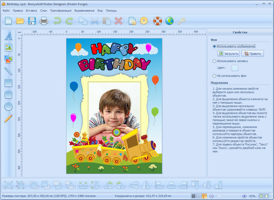 RonyaSoft Poster Designer - легкая в использовании программа для дизайна и печати привлекательных индивидуальных постеров и баннеров. Коллекция готовых шаблонов плакатов и интуитивный пользовательский интерфейс позволяют создавать собственные постеры и баннеры практически за несколько кликов.