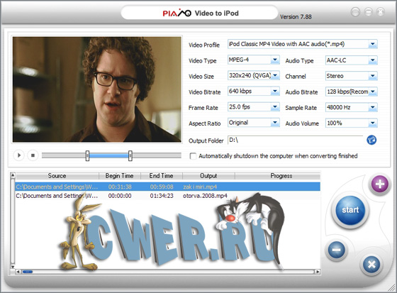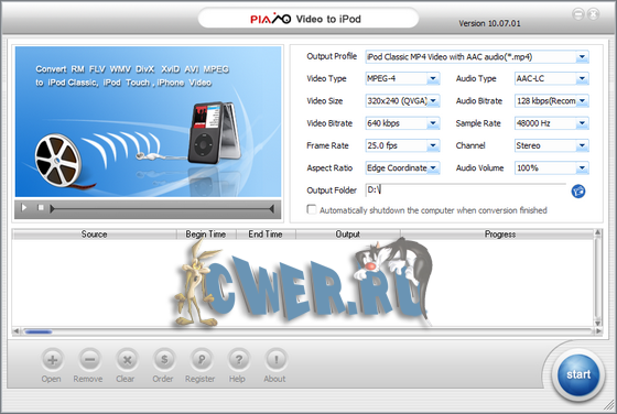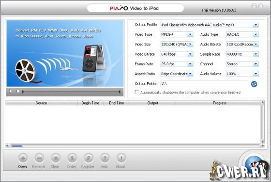 Plato Video To iPod Converter - программа для конвертирования видео в формат iPod, PSP, 3GP для просмотра на iPod, PSP (sony playstation portable), мобильных телефонах, Xbox, КПК, PMP. Способен работать почти со всеми форматами: rm, divx, xvid, avi, wmv, asf, mpg, mpeg, vob, mov, qt, vcd, svcd, Apple iPod MP4, Sony PSP MP4, 3GP, X-box MPEG2, PMP, PDA, SD Video ASF, AVI, MPG, MPEG, ASF, MOV, AMR, FLV, FLIC, SWF и другие.
