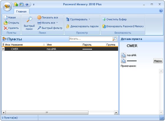 Password Memory - мощный менеджер паролей, сохраняющий все пароли, которые Вы используете на компьютере, в файл формата XML, HTML, Excel и т.д. Программа рекомендуется для людей, работающих на разных компьютерах, например дома и на работе. Сохранять пароли в браузере или программах, как известно, не безопасно. Но с программой Password Memory это уже не проблема. Вы можете установить её на флешку, и подключать к компьютеру, с которым работаете. Программа сама будет показывать Вам все пароли. В программе поддерживается многопользовательский режим работы. Доступ к своим данным можно защитить паролем.