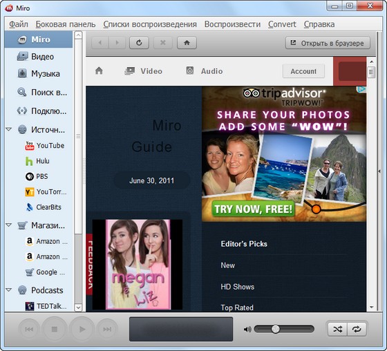 Miro - медиаплеер, основное предназначение которого - облегчение просмотра видео в Интернете. Плеер позволяет подключаться к видео-каналам, загружать видео-файлы на компьютер, просматривать ролики в полноэкранном режиме и т.д. Miro прост в работе и абсолютно бесплатен. Смотрите практически любое видео - Quicktime, WMV, MPEG, AVI, XVID и другие форматы. Просматривайте свою коллекцию, делайте плейлисты, сохраняйте порядок. Подписывайтесь на любые потоки RSS, содержащие видео, подкасты или видеоблоги. Исследуйте сотни свободных каналов при помощи встроенной программы передач.