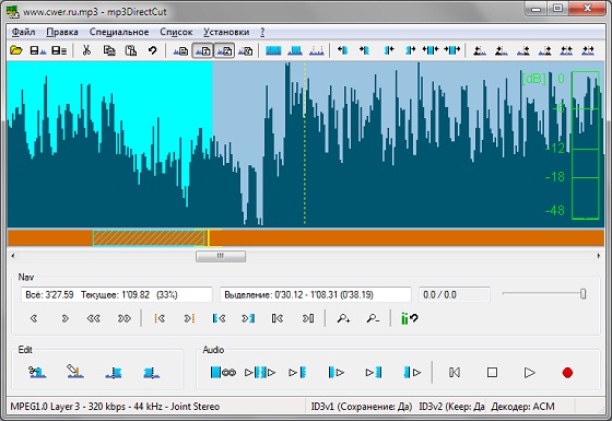 mp3DirectCut - простой аудиоредактор для разрезания MP3-файлов на части. Позволяет также изменять громкость звучания и копировать и вставлять отдельные фрагменты. Программа работает без потерь в качестве, т. к. процесс редактирования не требует перекодирования сжатого звука.