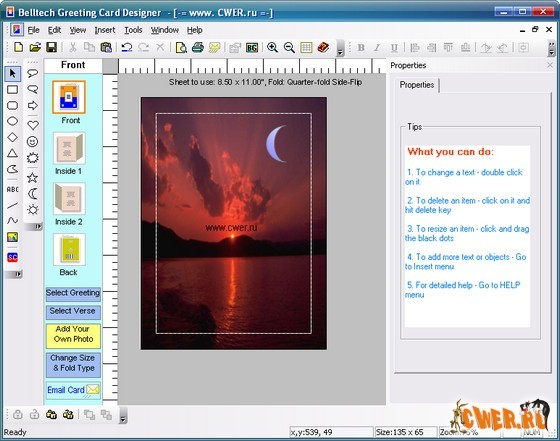 Belltech Greeting Card Designer - является профессиональным программным обеспечением, для разработки дизайна поздравительных открыток. Вы можете добавить свои собственные фотографии, клип-арты, рисунки и многое другое. Возможность добавить цвета и текстуры является уникальной особенностью этого приложения. Вы также можете копировать-вставить тексты и изображения из других приложений. Есть возможность сохранить ваш дизайн и изменить его позже. Можно вставить изображение в формате. JPG,. GIF,. BMP,. PNG,. TIF,. WMF.