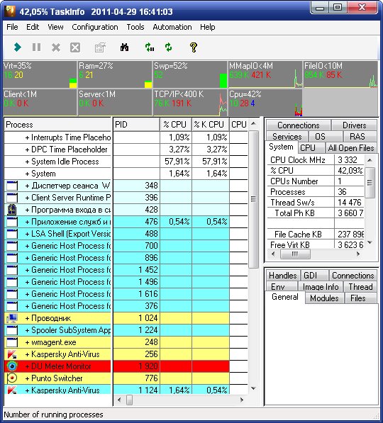 TaskInfo – мощное системное средство, сочетающее в себе функции менеджера процессов и программы для отображения системной информации. Выводит сведения о процессах и их нитях, которые выполняются на данном компьютере в режиме реального времени, подсчитывает процессорное временя, которое они занимают (в процентах и минутах), отображает тип процесса, его модули, переменные, память и другую полезную информацию. Позволяет управлять все теми же процессами, например, принудительно завершать или менять их приоритет.