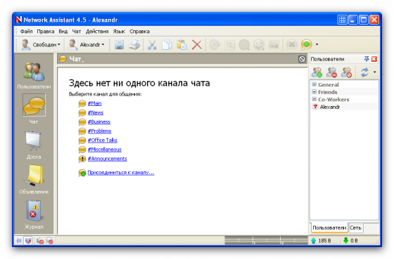 Network Assistant - программа для общения и эффективного взаимодействия по локальной сети, не требующая работы выделенного сервера. Основные возможности: многоканальный чат; общая доска для рисования; мгновенные сообщения; передача файлов; управление процессами на удаленном компьютере; просмотр копии экрана/буфера обмена удаленного компьютера; статистика использования; сигнализаторы удаленных событий и др. Имеет пять стандартных состояний и позволяет создавать до десяти пользовательских. Совместима с WinPopup. Присутствует доска обьявлений, для нее требуется открыть на одном из компьютеров в сети папку на полный доступ. Для обьявлений можно выставить срок жизни в днях.