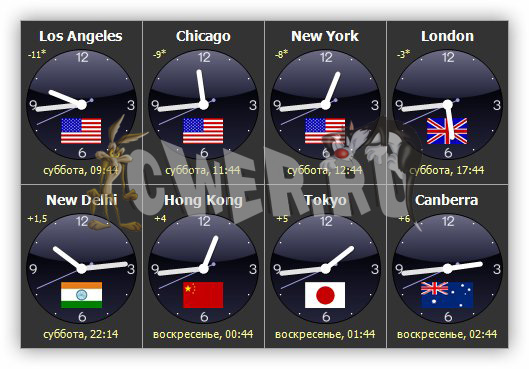 Sharp World Clock - программа, предназначенная для показа мирового времени. Позволяет установить неограниченное число часов в линию или в виде таблицы. Внешний вид часов может иметь различный дизайн, так же часы могут быть цифровыми или обычными, с круглым циферблатом, часы способны показывать флаг страны и изменяемы в размерах от очень маленьких до полноэкранных. Программой поддерживается множество стилей. Настраиваемый список городов каждой страны мира. Вы сможете добавлять, изменять и редактировать города.