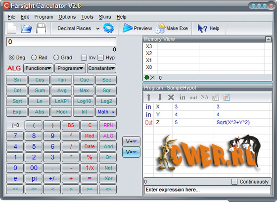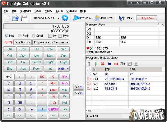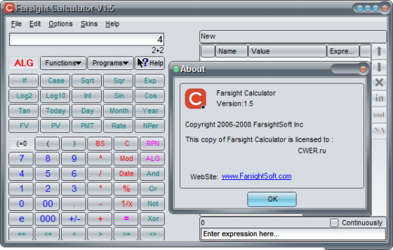 Farsight Calculator - удобный в работе программируемый калькулятор, позволяющий сохранять процесс вычисления как программу или функцию и выполнять арифметические операции любым алгебраическим методом. Программа поддерживает больше ста функций, включая алгебраические, тригонометрические, гиперболические, статистические, и финансовые функции. Кроме того Farsight Calculator содержит ряд мощных специализированных инструментов. Прост в использовании, имеет удобный интерфейс, работает на всех платформах операционных систем Windows.