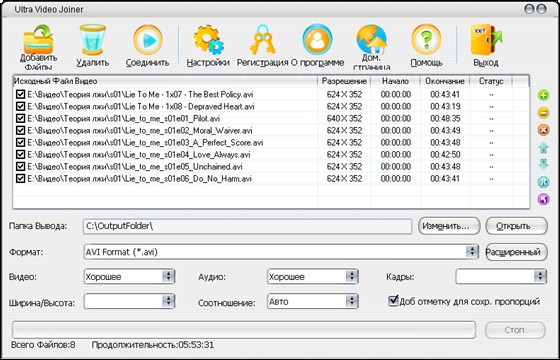 Ultra Video Joiner - это профессиональная программа для соединения неограниченного количества видео файлов в один большой. Данная программа поддерживает AVI, DivX, MPEG1, MPEG2, VOB, DAT, WMV, ASF форматы, позволяет конвертировать между этими форматами, настроить кодек, размер, битрейт, число кадров в секунду и т.д.