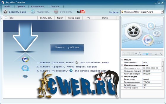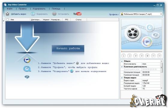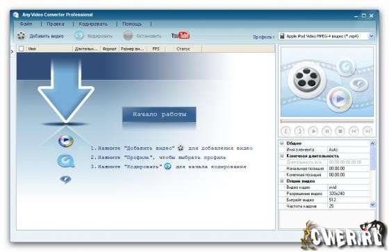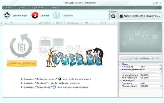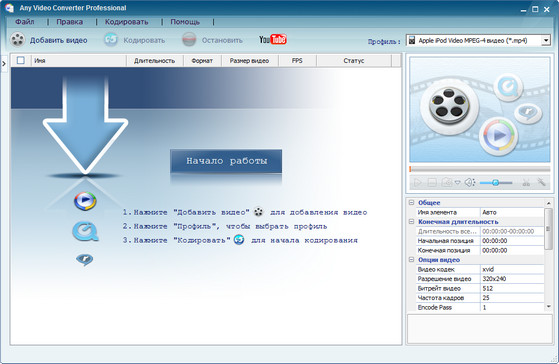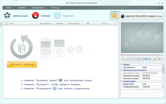 Any Video Converter Pro - это средство с графическим интерфейсом, быстрой скоростью и высоким качеством, позволяющее легко переводить видео в различные форматы. Данное средство позволяет вам без лишних усилий переводить видео файлы в любой формат БЕСПЛАТНО! Данная программа может переводить практически все видео средства, включая DivX, XviD, MOV, rm, rmvb, MPEG, VOB, DVD, WMV, AVI в формат MPEG-4 для iPod/PSP или других портативных видео устройств, МР4 плейера или смартфона. Программа обладает невероятно быстрой скоростью и высоким качеством. Any Video Converter позволяет вам получать удовольствие от просмотра любого формата видео на вашем iPod, Zune, PSP, мобильном телефоне или МР4 плейере.