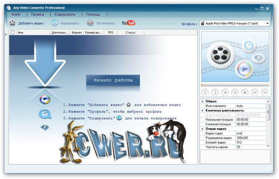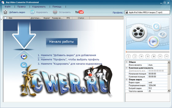 Any Video Converter Professional - программа для конвертирования видео файлов. Она позволяет перекодировать популярные видео форматы (AVI, MOV, RM, MPEG, DVD, WMV, MP4 и FLV) в DVD, VCD, MP4 или FLV. В утилите присутствует возможность использовать для кодирования файлов как готовые профили с установленными параметрами видео, которые ориентированы на определенные устройства (бытовой DVD-проигрыватель, мобильный телефон), так и самостоятельно подбирать свои настройки конвертирования. Перед началом кодирования видео, его можно просмотреть во встроенном проигрывателе. В программе есть функция конвертирования только выбранного участка видео файла, для чего во встроенном плеере достаточно указать начало и конец нужного отрезка. Программа имеет мультиязычный интерфейс, включая русский язык.