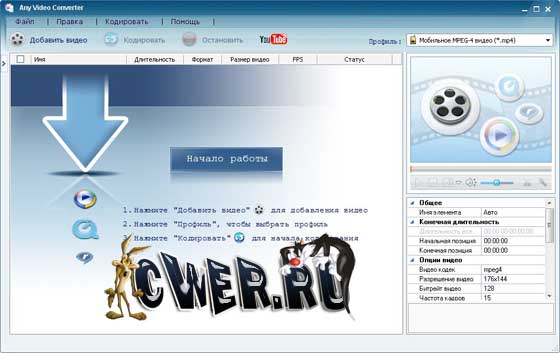 Any Video Converter - программа для конвертирования видео файлов, позволяет перекодировать популярные видео форматы (AVI, MOV, RM, MPEG, DVD, WMV, MP4 и FLV) в DVD, VCD, MP4 или FLV. В утилите присутствует возможность использовать для кодирования файлов как готовые профили с установленными параметрами видео, которые ориентированы на определенные устройства (бытовой DVD-проигрыватель, мобильный телефон), так и самостоятельно подбирать свои настройки конвертирования. Перед началом кодирования видео, его можно просмотреть во встроенном проигрывателе. В программе есть функция конвертирования только выбранного участка видео файла, для чего во встроенном плеере достаточно указать начало и конец нужного отрезка.