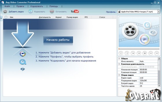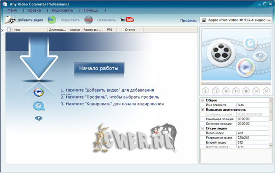 Any Video Converter Pro - это программа с графическим интерфейсом, быстрой скоростью и высоким качеством, позволяющее легко переводить видео в различные форматы. Данное средство позволяет вам без лишних усилий переводить видео файлы в любой формат! Программа может переводить практически все видео средства, включая DivX, XviD, MOV, rm, rmvb, MPEG, VOB, DVD, WMV, AVI в формат MPEG-4 для iPod/PSP или других портативных видео устройств, МР4 плейера или смартфона. Программа обладает невероятно быстрой скоростью и высоким качеством. Any Video Converter позволяет вам получать удовольствие от просмотра любого формата видео на вашем iPod, Zune, PSP, мобильном телефоне или МР4 плейере.
