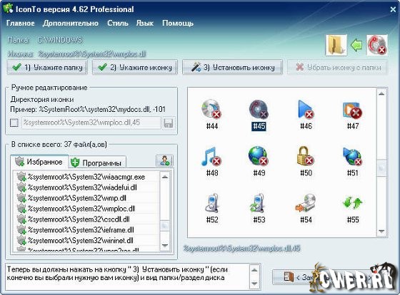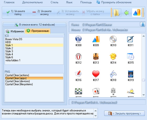 IconTo - программа предназначена для быстрого и удобного изменения вида значка папок и разделов диска на любые указанные вами (ICO, CUR, ICL или из ресурсов DLL, EXE и т.д.) в операционных системах семейства Windows. Для более быстрого доступа к избранным значкам в IconTo содержится небольшой список системных ресурсов Windows, в которых находятся значки, список, который, можно пополнять самостоятельно. Так же, в программе присутствуют встроенные значки, состоящие из разных стилей и подходящие под разные операционные системы, количество которых превышает 300 штук.