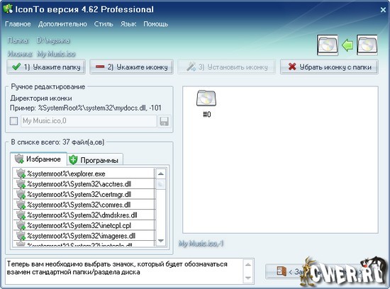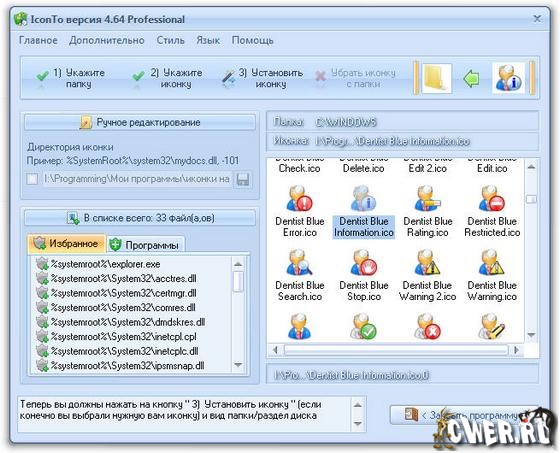 Программа IconTo предназначена для быстрого и удобного изменения вида значка папок и разделов диска на любые указанные вами (ICO, CUR, ICL или из ресурсов DLL, EXE и т.д.) в операционных системах семейства Windows. Для более быстрого доступа к избранным значкам в IconTo содержится небольшой список системных ресурсов Windows, в которых находятся значки, список, который, можно пополнять самостоятельно. Так же, в программе присутствуют встроенные значки, состоящие из разных стилей и подходящие под разные операционные системы, количество которых превышает 300 штук.