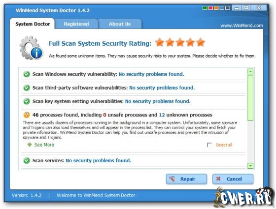 WinMend System Doctor является усовершенствованным центром безопасности Windows. С ее новаторским и интеллектуальным двигателем обнаружения, программа может эффективно обнаруживать и устранять уязвимости безопасности в системе, установить уязвимости в сторонних приложениях и предотвратить запуск вредоносных программ, троянов, вирусов, процессов.