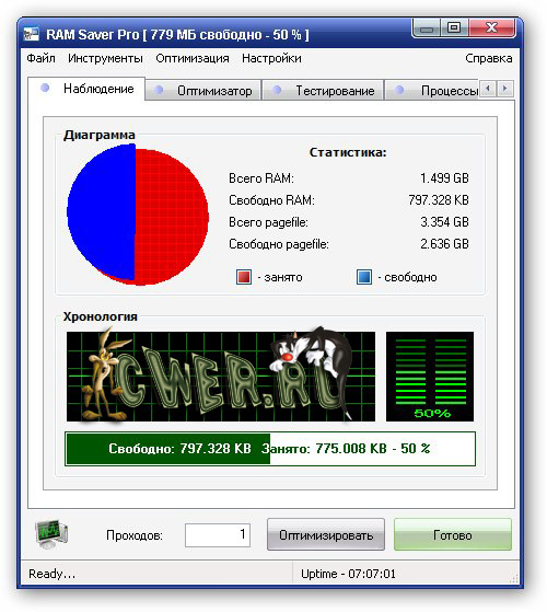 RAM Saver Pro - инструмент для профессионального мониторинга, очистки и оптимизации оперативной памяти. Скачав его на cwer.ws, вы сможете увеличить производительность операционной системы, освободив оперативную память от драйверов и процессов Windows для приложений, нуждающихся в максимальной загрузке процессора и оперативной памяти. RAM Saver Pro дефрагментирует системную память для быстрого доступа к ней, улучшает эффективность работы процессора и кэша памяти, восстанавливает утечку памяти в плохо оптимизированных приложениях, временно помещает не используемые библиотеки и драйверы в swap-файл, освобождая RAM.