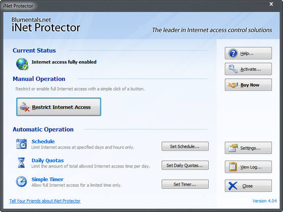 Blumentals iNet Protector - главная задача данной утилиты заключается в том, что она защищает паролем ваше интернет-соединение. Для того чтобы соединиться с сетью, вам будет необходимо ввести определенное кодовое слово, заданное до этого в данной программе. Кроме того, данная утилита позволяет задавать временные ограничения на доступ в интернет, что наверняка понравится родителям, которые не желают, чтобы их ребенок дни и ночи напролет проводил в чатах и прочих нежелательных ресурсах. Воспользоваться доступом в интернет в отсутствие владельца компьютера может кто угодно, чтобы избежать незапланированных денежных потерь и оставить всех с носом, мы рекомендуем воспользоваться данной программой.