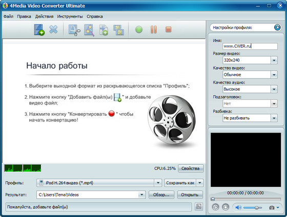 4Media Video Converter Ultimate - Конвертер большинства популярных аудио и видео форматов в другие аудио и видео форматы, поддержка MOV, AVI, WMV, MPEG1/2/4, 3GP, ASF, MP4, MP2, MP3, WMA, OGG, AAC, M4A, WAV, AC3 и других форматов, поддержка iPod, Apple TV, PSP, PS3, Zune, Archos, iRiver, Creative Zen аудио и видео форматов, конвертирование видео из одного в формата в другой, извлечение аудио в MP3, WMA, OGG, AAC, M4A, WAV, AC3 форматы, пакетный режим конвертирования, выбор и настройка качества, разрешения, битрейда, фреймрейда и других параметров, предварительный просмотр результата в встроенном проигрывателе.