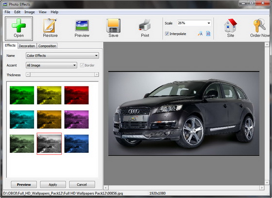 Photo Effects - это программа для обработки фотографий при помощи разнообразных фильтров. С её помощью можно полностью преобразить любое изображение. Программа позволяет использовать более 50-ти эффектов, включая как традиционные, так и оригинальные. Вы сможете увидеть свои фотографии на фоне дождя и снега, в тумане и под облаками, добавить солнечный свет или закружить в потоке тайфуна.
