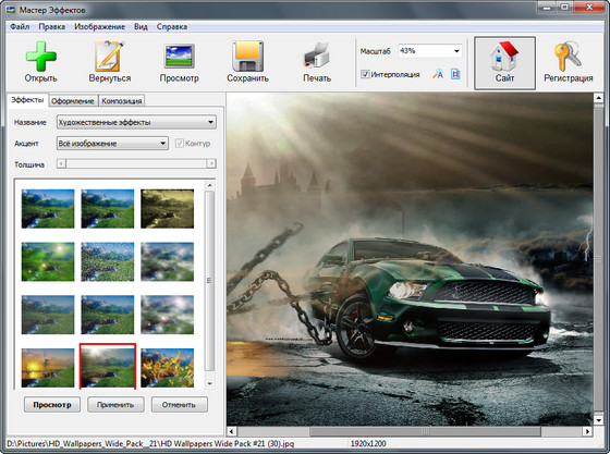 Мастер Эффектов - это новая программа для обработки фотографий при помощи разнообразных фильтров. С её помощью можно полностью преобразить любое изображение. Программа позволяет использовать более 50-ти эффектов, включая как традиционные, так и оригинальные. Вы сможете увидеть свои фотографии на фоне дождя и снега, в тумане и под облаками, добавить солнечный свет или закружить в потоке тайфуна.
