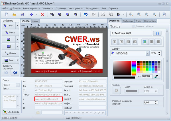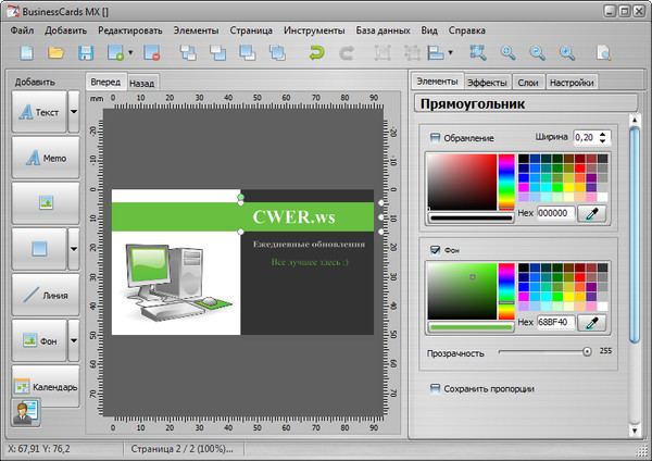 BusinessCards MX - программа для создания и проектирования визиток. При помощи этой программы Вы легко и быстро спроектируете и распечатаете профессиональные визитки. Интерфейс программы спроектирован так, чтобы даже у начинающего пользователя не было проблем с обслуживанием программы. Процесс проектирования заключается во вставке готовых доступных в программе элементов таких, как текст, фигуры, изображения и фон, а также произвольном их перемещении на разрабатываемом проекте. Программа использует шаблоны визиток, которые можно подготовить самому или использовать готовые образцы визиток, доступные в программе. В программе доступны около 400 образцовых шаблонов визиток.