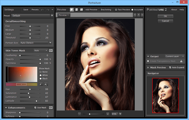 Imagenomic Portraiture - плагин для Adobe Photoshop и Photoshop Elements, позволяющий ретушировать цифровые фотографии. Скачав его на cwer.ru, вы сможете устранять недостатки кожи, сохраняя текстуру и другие важные детали портрета, такие как волосы, брови, ресницы и т.д. В настройках плагина вы сможете указать силу воздействия, смягчение, степень детализации и отрегулировать резкость, изменить тон, яркость и контрастность. Уникальной особенностью программы является встроенная функция автоматической маски, которая помогает быстро и автоматически обнаружить диапазон тона кожи на изображении, и при желании вы сможете вручную настроить его, чтобы обеспечить оптимальные результаты - невиданную точность и производительность.