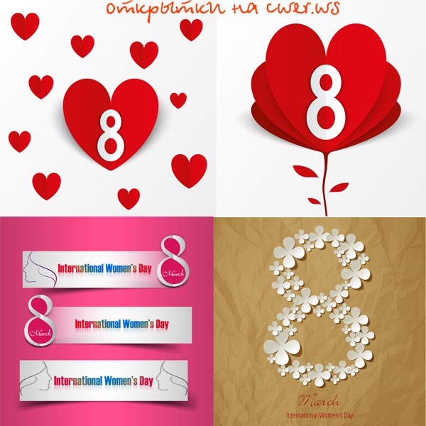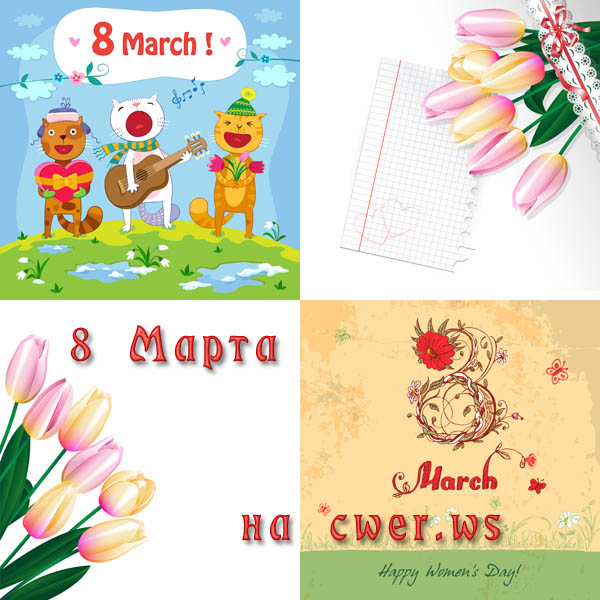 Замечательные векторные изображения и открытки, которые отлично подойдут для поздравления любимых женщин в красивый весенний день 8 марта! Профессиональный клипарт представлен в формате EPS, поэтому пространства для творчества будет предостаточно, чтобы создать свой шедевр к международному женскому дню.