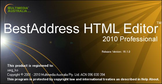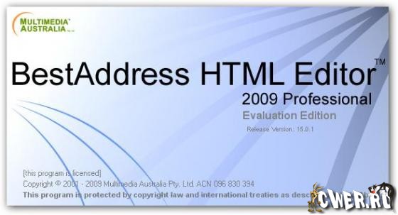 BestAddress HTML Editor – полнофункциональный HTML-редактор от компании Multimedia Australia, позволяющий без особого труда создать собственный сайт в сети Интернет. Программа умеет создавать меню на основе DHTML-кода, проверяет синтаксис, подчеркивает ошибки, обладает поддержкой интеллектуального ввода кода, обладает богатым набором встроенных шаблонов и может быть использована для обновления ранее созданного ресурса. Пользователям программы доступна помощь в режиме онлайн, которая содержит всесторонние рекомендации по работе с утилитой, информацию консультационного характера и исчерпывающую справочную информацию о HTML-коде версии 4.01 и CSS2.