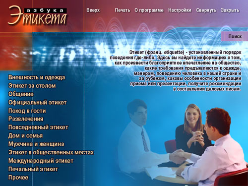 На диске рассказывается о различных сторонах сложной области, именуемой этикетом и правилами отношений: разделы, посвященные правилам поведения в гостях, за столом, при официальных приемах и т.д.
