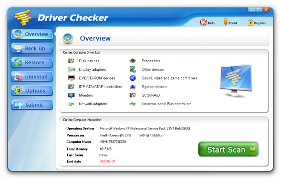 Driver Checker - новый менеджер драйверов который не только обнаружит и "вытащит" драйвера из системы для их возвращения на место после переустановки системы, но и обновит их на более свежие, из большой базы данных оригинальных драйверов от производителей. Поддерживает и автоматически обновляет драйвера: принтеров и сканеров, USB, звука, Vista, Bluetooth, мыши и клавиатуры, Видео, RAID, модемов и сетевых карт, веб-камер, графических карт, VGA и других Windows-драйверов.