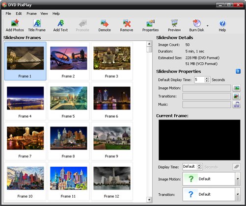 DVD PixPlay - программа для создания из картинок, видео и музыки, дисков формата DVD, VCD или SVCD. Поддерживает все популярные форматы графики (JPEG, JPEG2000, GIF, BMP, PNG и т.д.), форматы фотокамер (CRW, CR2, NEF и т.д.), звуковые (MP3 и WAV) и видео форматы (AVI, MPEG). Есть возможность добавления фоновой музыки и разных эффектов для последующего просмотра на DVD проигрывателе. Содержит более 160 графических эффектов.