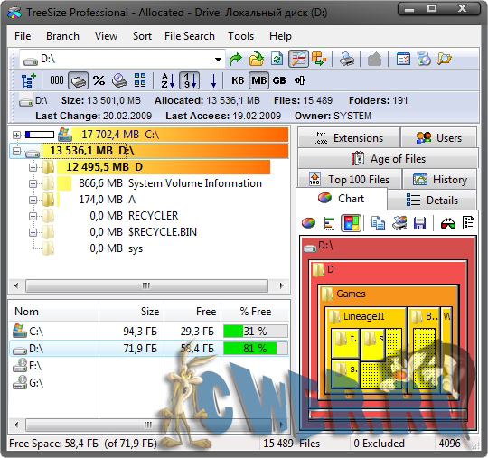 Утилита для лучшего понимания "куда уходит место на диске". TreeSize просканирует заданный диск (папку) и покажет все файлы и папки - кто сколько места занимает. TreeSize Pro позволяет просматривать результаты в виде диаграмм и графиков, есть гиперподробные детали, сортировка файлов по расширению, более продвинутые настройки и, наверно самый главный плюс - File Search. Удобная утилита для поиска и удаления самых больших файлов, старых файлов, ненужных (*.tmp, *.$$$) файлов и т.д.