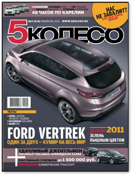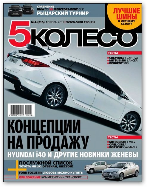 5 Колесо - один из самых популярных автомобильных журналов в России, имеющий многолетнюю успешную историю развития. Это единственное на рынке интерактивное автомобильное издание, которое создается вместе с читателями. Концепция издания - "Создаем журнал вместе!" - позволяет знакомить аудиторию не только с мнениями профессионалов, но и c опытом тысяч компетентных автолюбителей. Издание рассчитано на широкий круг автолюбителей, автомобилистов-профессионалов, представителей автомобильного бизнеса. Одной из главных особенностей журнала являются непосредственное участие читателей в испытаниях автомобилей, представленных на российском рынке, а также самый полный каталог автомобилей, официально продаваемых на российском рынке.