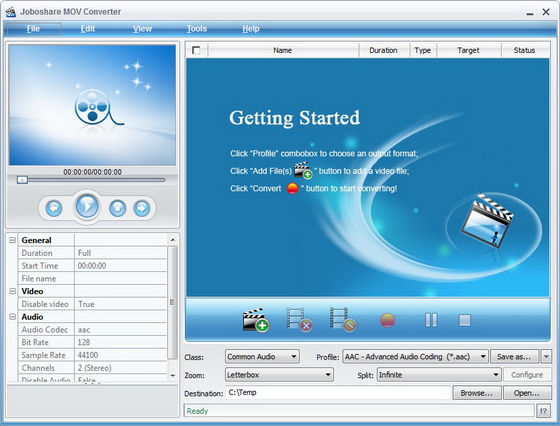 Joboshare MOV Converter - конвертер QuickTime MOV видео в другие популярные форматы, поддержка WMV, ASF, RM, RMVB, AVI, DIVX, Xvid, MPEG, VCD, DVD, SVCD, MPEG1, MPEG2, VOB и других видео форматов, извлечение аудио из видео файлов в MP3, WAV форматы, пакетный режим конвертирования, настройка параметров конвертирования, предварительный просмотр результата. Программа поддерживает настройки параметров аудио / видео кодеков и имеет ID3 функцию редактирования аудио-форматов, таких как WMA и MP3.