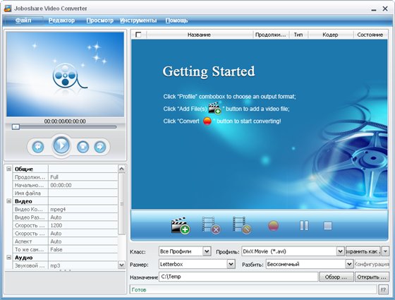 Joboshare Video Converter - простая и стабильная программа для быстрой конвертации видео и аудио форматов. Программа имеет возможность выбора и настройки параметров конвертирования, пакетный режим конвертирования, предварительный просмотр результата и другие функции. А высокая скорость работы и приятный, удобный интерфейс сделают Joboshare Video Converter незаменимым. Поддерживает практически все популярные видео и аудио форматы, такие как AVI, MPEG, WMV, DivX, MP4, H.264/MPEG-4 AVC, RM, MOV, XviD, 3GP, FLV, VOB (видео формат, используемый в DVD), DAT (видео в формате VCD, SVCD), MP2, MP3, WMA, WAV, RA, M4A, AAC, AC3, OGG и т.д. Поддерживает форматы мобильных устройств iPod, iPhone, Apple TV, Zune, PSP, Pocket PC, Creative Zen, Archos и так далее.