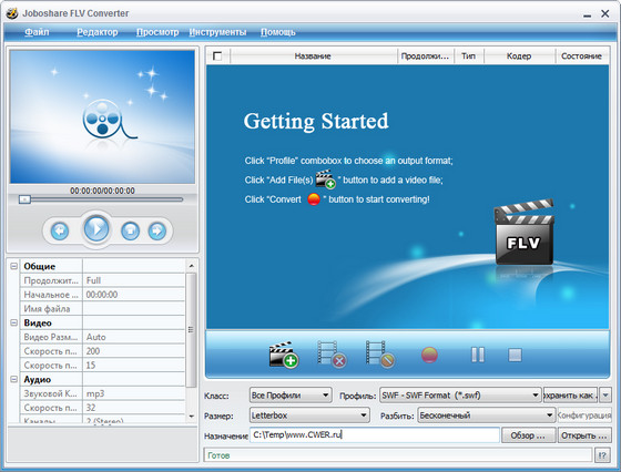 Joboshare FLV Converter - конвертер большинства популярных видео форматов в FLV формат, поддержка DivX, XviD, WMV, 3GP, AVI, MP4, M4V, ASF, RM, RMVB, MOV, VOB, MPEG, FLV и других видео форматов, извлечение аудио из видео файлов в MP2, MP3, M4A, AC3, AAC, RA, WMA, OGG, APE, CUE и другие аудио форматы, пакетный режим конвертирования, настройка параметров конвертирования, предварительный просмотр результата ...