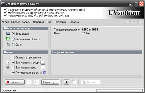 UVScreenCamera - программа для быстрого создания демонстрационных и обучающих фильмов в формате UVF, EXE, SWF, AVI со звуком. Фильмы в формате UVF и EXE получаются очень компактного размера (2-х минутный фильм с разрешением 1024x768x32 занимает 194 К). Мощный редактор поясняющих выносок и рамок для выделения. Эффект плавного появления. Разбивка фильма на именованные сегменты для быстрого перехода к нужному эпизоду, можно компоновать фильм из отдельных сегментов. Визуализация щелчков мыши (левая, правая, средняя кнопка, вращение ролика) и нажатий клавиш на клавиатуре (например: Ctrl + C, Esc и т.д.). Подробная справка на русском. Запись 3D игр. Есть возможность размещать фильмы на web страницах, сохранять области экрана (ScreenShot) в bmp, jpg, gif.