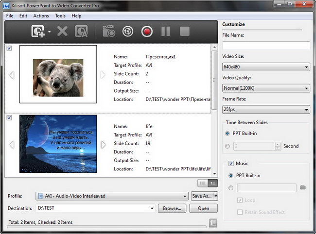 Конвертер MS PowerPoint файлов презентаций в другие видео форматы, поддержка ppt, pptx, pptm, ppsx, pps, ppsm, potx, potm, pot и других файлов презентаций, конвертирование в AVI, H.264/MPEG-4 AVC, MPEG2, WMV, MOV, FLV, HD H.264/MPEG-4 AVC, HD MPEG 2 TS, HD WMV, HD AVI, HD MOV и другие форматы, конвертирование презентаций в FLV формат с оптимизацией для YouTube, Google Video и других сервисов, поддержка пакетного режима работы, предварительный просмотр результата, выбор и настройка параметров конвертирования.