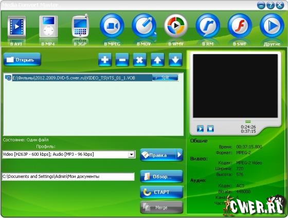Media Convert Master - умеет конвертировать файлы из одного видеоформата в другой. Причём делает всё это на огромном числе популярных форматов: AVI, MP4, 3GP, MPEG, MOV, WMV, RM, SWF, AAC, AC3, MP2, MP3, AMR, WAV, VOB,ASF.