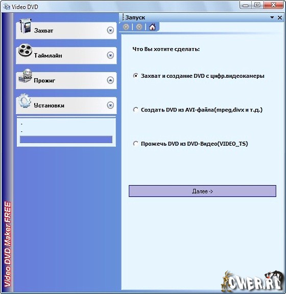 Video DVD Maker может создавать DVD на основе видеофайлов в форматах AVI, DIVX, XVID, MP4, MPG, WMV, ASF, MOV, а также выполнять захват видео с ТВ-тюнера, веб-камеры, DV-камеры и других устройств. Работа программы организована в виде пошагового мастера, и процесс создания диска разбит на три этапа: захват видео, добавление дополнительных файлов, запись DVD. Программа поддерживает запись на любые типы дисков, в том числе двухслойные DVD. Русский интерфейс присутствует.