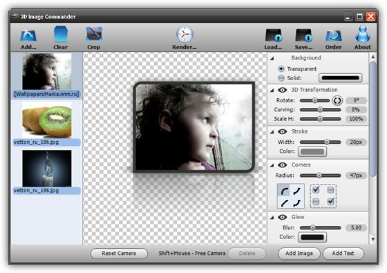 3D Image Commander - это полнофункциональная программа, которая позволит вам создавать непревзойденные эскизы страниц с различными 3D стилями и эффектами. Вы также сможете накладывать водяные знаки на ваши творения. Создавайте изображения с такими эффектами, как трехмерная перспектива и трехмерная кривая, отражение, свечение, уголки и мазки. Программа поддерживает такие форматы, как BMP, JPG, GIF, PNG, TIFF и PSD.