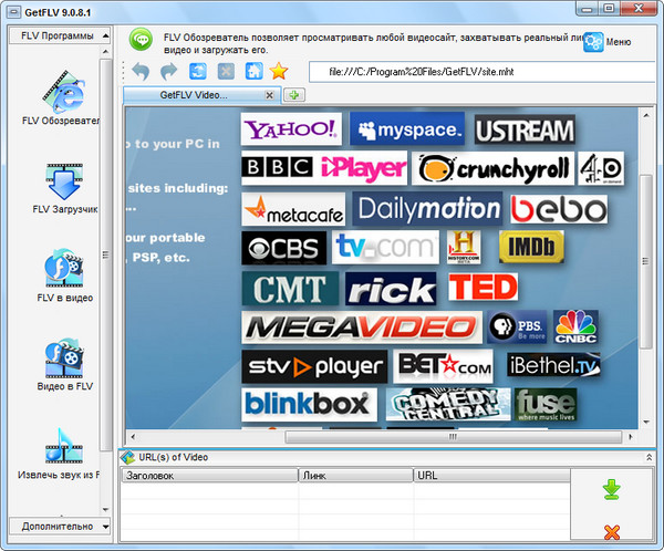 GetFLV Pro - это программный продукт состоящий из 7 модулей, который позволяет производить весь спектр операций с .flv файлами. GetFLV Pro позволяет скачивать, управлять, конвертировать в различные форматы и из различных форматов, извлекать звук, восстанавливать и воспроизводить FLV видео.
