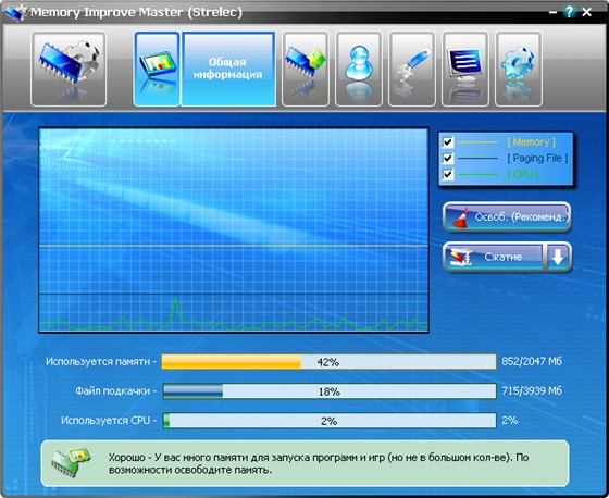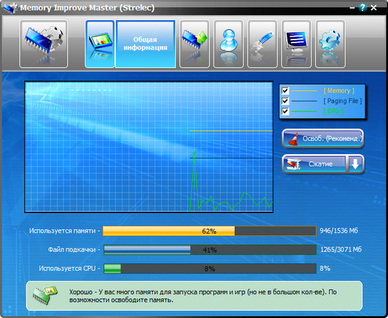 Memory Improve Master - позволяет увеличить быстродействие вашего компьютера за счет освобождения (дефрагментации) оперативной памяти. Имеется возможность установки минимального количества свободной оперативной памяти, при превышении которого запустится модуль и попытается удалить из оперативной памяти лишние процессы. Кроме этого, есть возможность просмотра запущенных процессов, наблюдение за нагрузкой на ЦП и множество других полезных настроек.