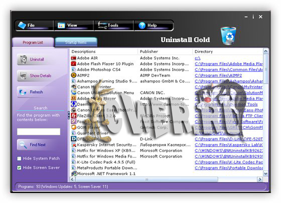 Uninstall Gold - программа для деинсталляции приложений, обладает большим количеством функций: показывает скрытые установленные программы, сортирует список программного обеспечения по заданному фильтру, удаляет некорректно инсталлированные и деинсталлированные программы.