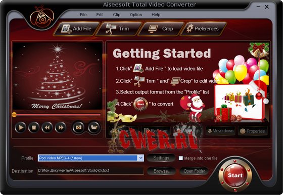 Aiseesoft Total Video Converter - программа предназначена для конвертации видео в форматы MP4, H.264, AVI, WMV, WMA, FLV, MKV, MPEG-1, MPEG-2, 3GP, 3GPP, MOV, RM, RMVB, M4A, AAC, WAV и т.д. Поддержка популярных мультимедиа проигрывателей, таких как: PSP, iPod, iPhone, PS3, Zune, iRiver, Walkman, Pocket PC и т.д. Функция извлечения аудиодорожек из входного файла и конвертации в форматы M4A, MP3, AC3, AAC, WMA, WAV, OGG. Функция для извлечения и конвертации определенной части входного файла. Настройка параметров аудио и видео для выходного файла. Слияние нескольких видеофайлов в один. Функция, позволяющая обрезать часть кадра. Режим «Zoom», позволяющий настроить размер и качество изображения.