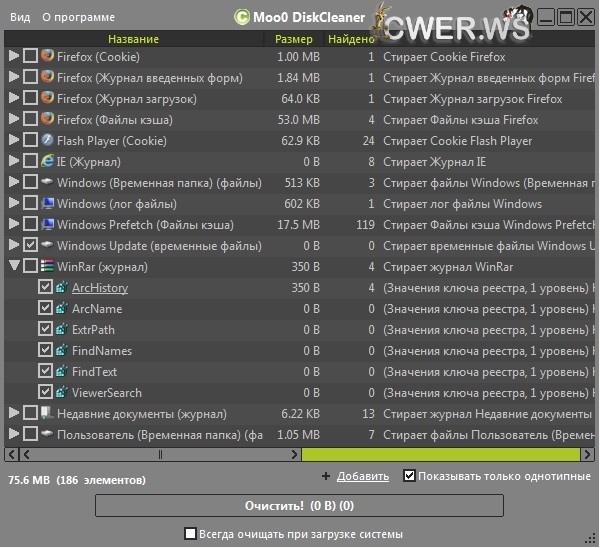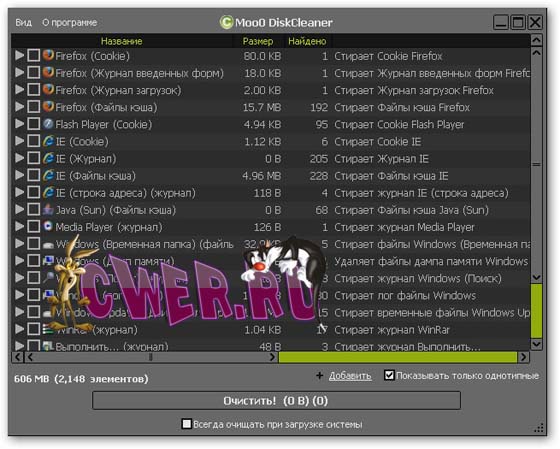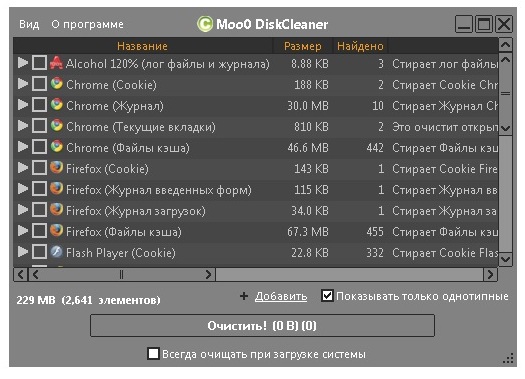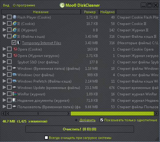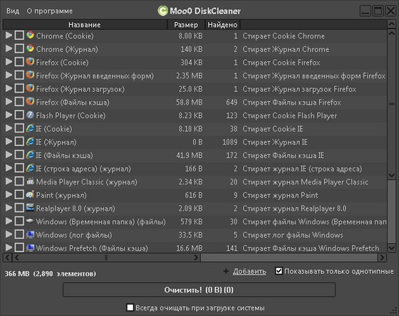 Moo0 DiskCleaner позволяет Вам с помощью одного клика очистить любую информацию с Вашего диска: все что Вам нужно - это указать от чего именно Вы хотите избавиться и просто отметить нужные пункты в предоставляемом программой списке. Программа предоставляет список из более 130 различных предметных областей, которые нуждаются в чистке, среди которых: временные файлы интернета, личные данные, реестр, кэш интернет браузера, файлы истории ну и конечно же cookies.