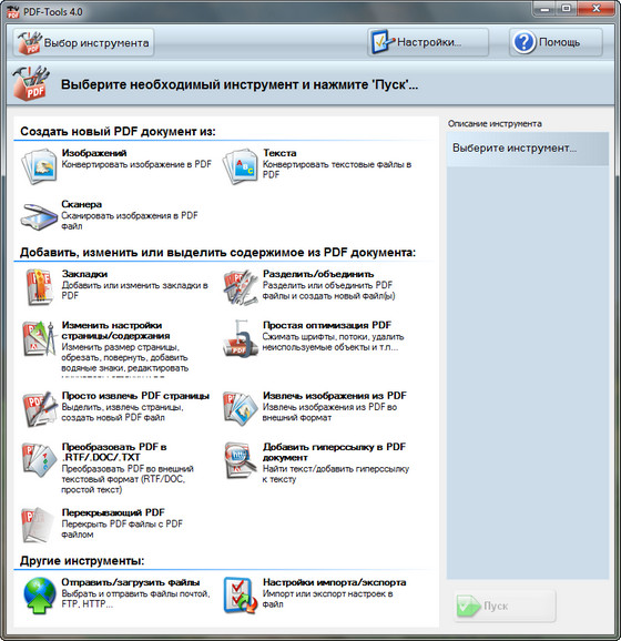 PDF-Tools — набор полезных инструментов для манипуляции с PDF файлами. С помощью данного набора вы сможете с легкостью создавать новые PDF документы из изображений, сканера и текстовых документов, изменять содержимое существующих PDF документов (добавление закладок, объединение и разъединение PDF файлов, извлечение страниц и изображений, оптимизация PDF документов, изменение настроек PDF документа, включая размер и разрешение страницы, конвертация PDF в оффисные документы и т.д.), а также отправлять и загружать файлы по почте или через FTP-соединения. Стоит упомянуть, что данная программа входит в состав PDF-XChange Pro. Все операции в программе осуществляются с помощью пошаговых мастеров. Интерфейс программы многоязычный и обладает поддержкой русского языка.