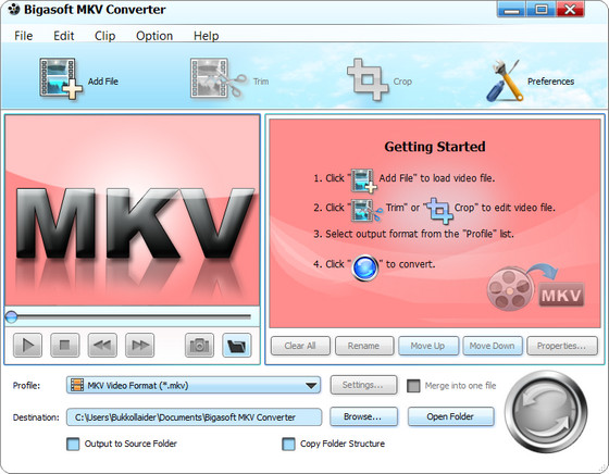 Bigasoft MKV Converter - поможет преобразовать MKV файлы во все популярные видео форматы, такие как AVI, DivX, Xvid, WMV, MP4, H.264, MOV, HD video и другие или извлекать MP3, WAV, WMA, AAC и M4A. Есть поддержка пакетного режима работы, предварительный просмотр результата, выбор и настройка кодеков, выбор и настройка параметров конвертирования, поддержка iPod, PSP, Apple TV, PS3, Xbox и других мобильных устройств, высокая скорость работы, высокое качество результата, приятный и удобный интерфейс.